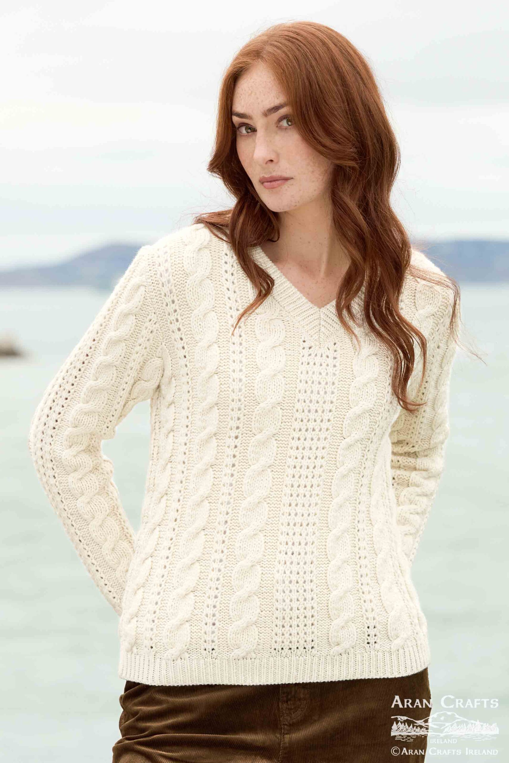 Ladies’ V-neck sweater crafted from luxuriously soft Merino wool. Knit in a classic cable stitch pattern, this sweater is both cozy and elegant.