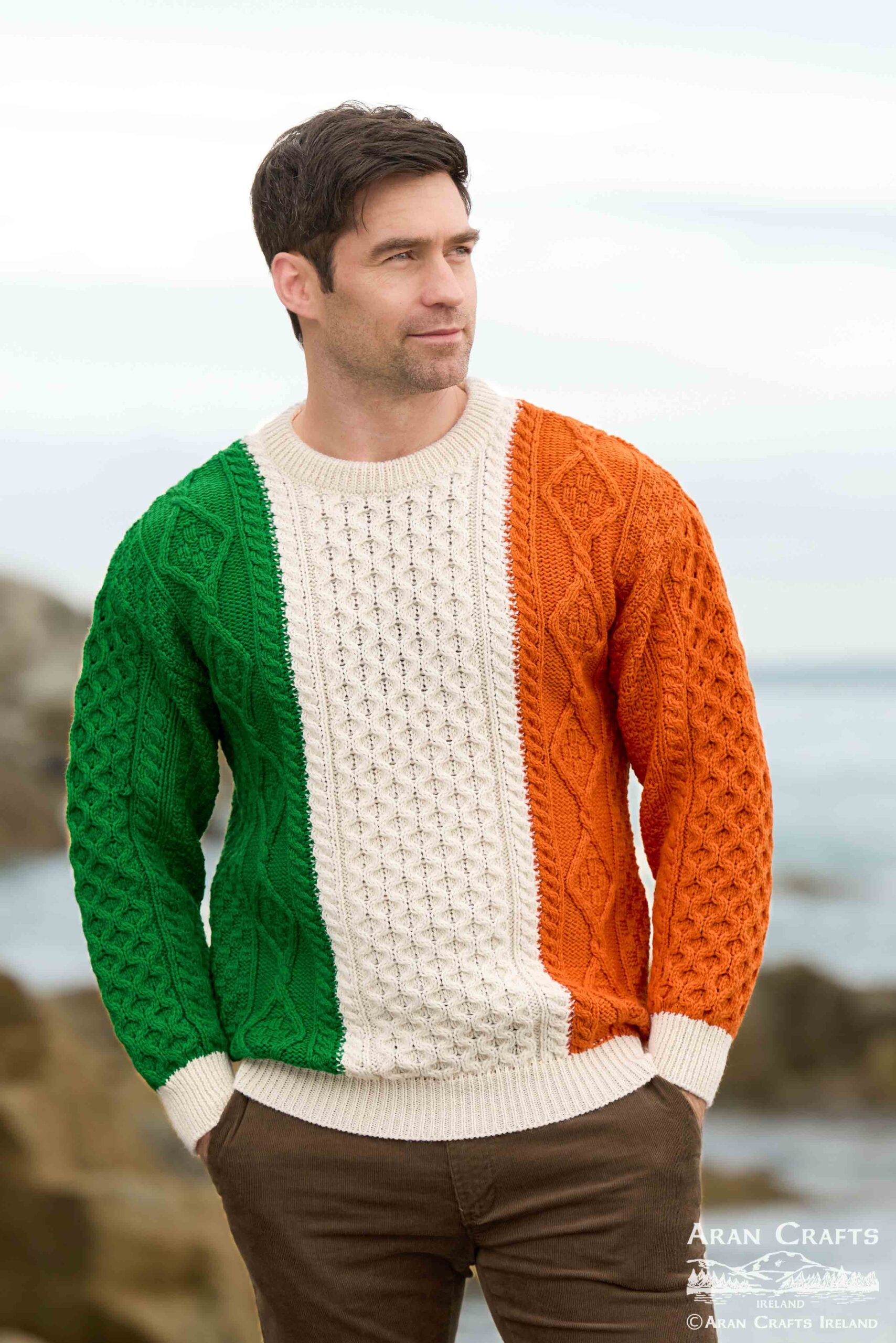 This traditional Aran crew-neck unisex sweater is knitted in the Irish tricolours. Knit with a combination of honeycomb, cable and moss stitches throughout, adding a beautiful feature to the classic Aran design.