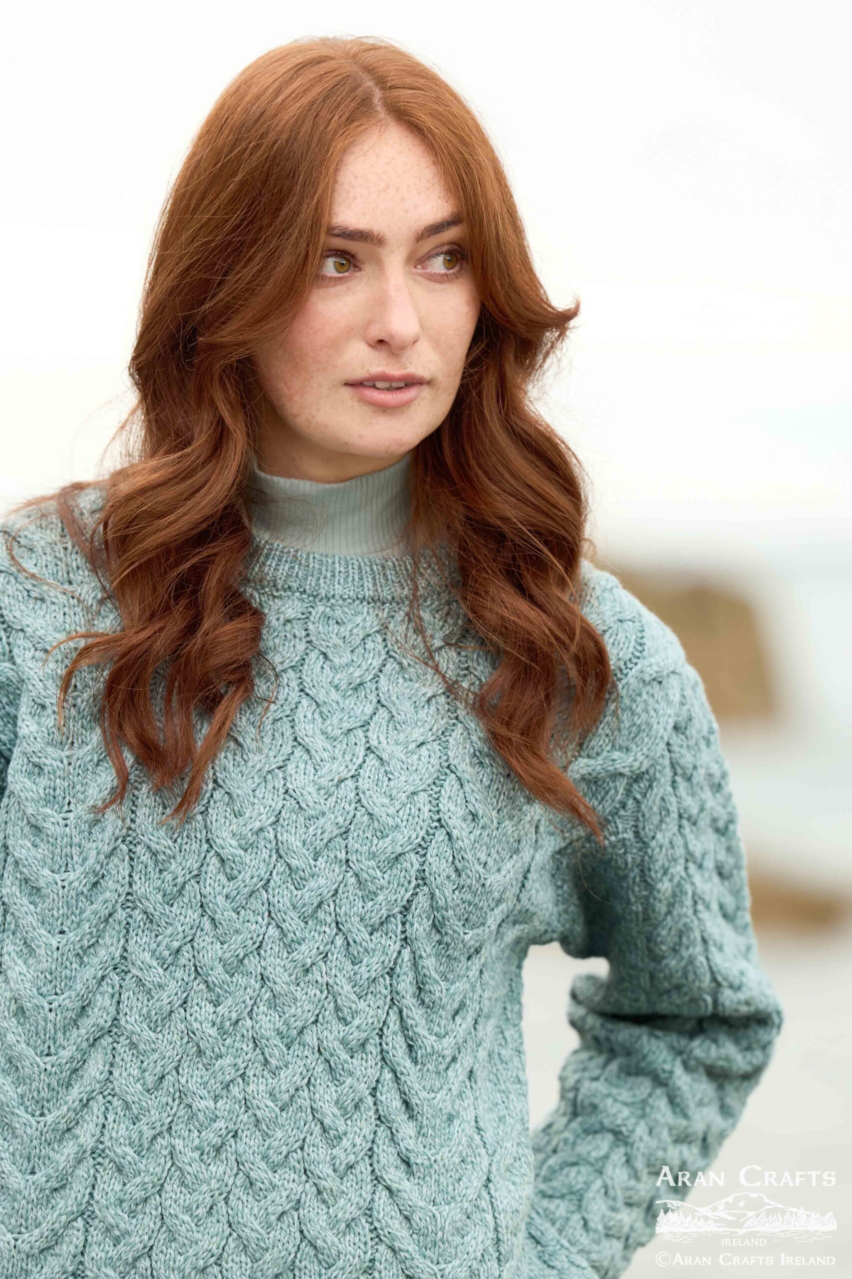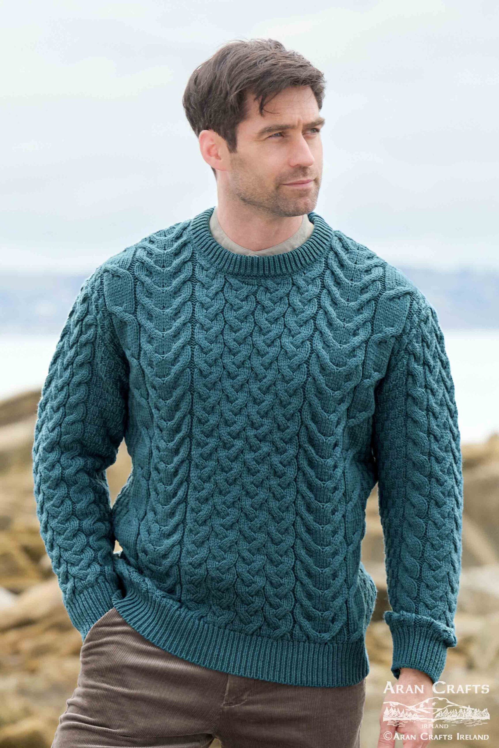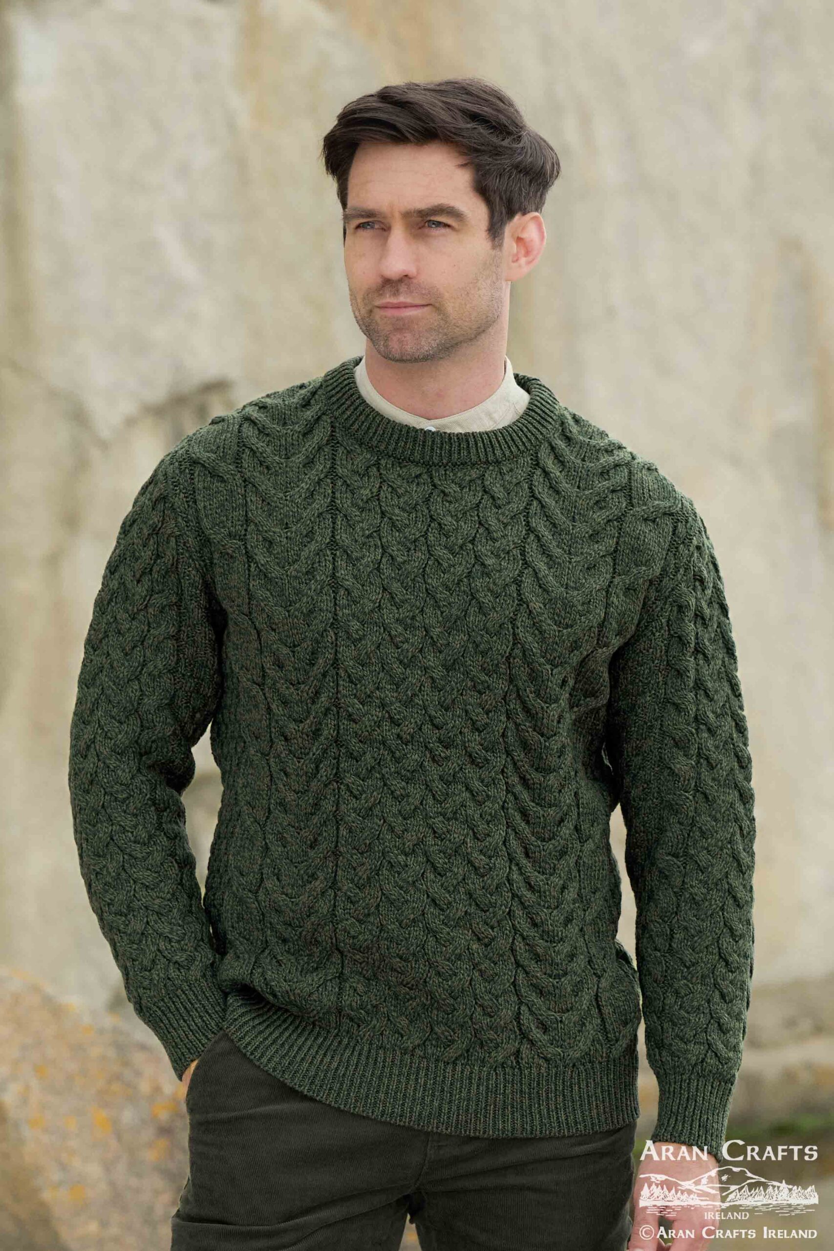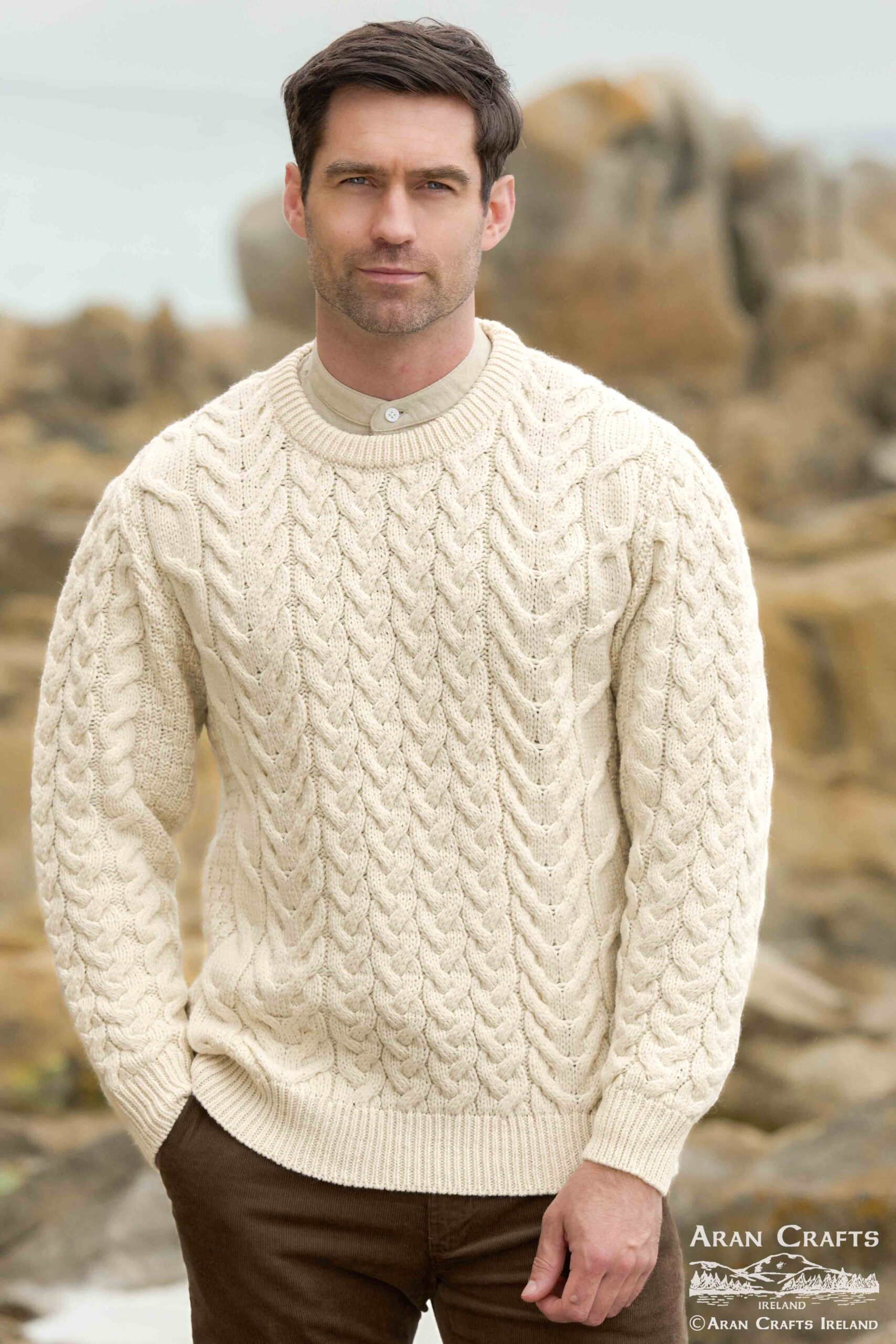 Beautiful chunky cable knit unisex sweater crafted from 100% Merino wool, featuring traditional Aran stitches.