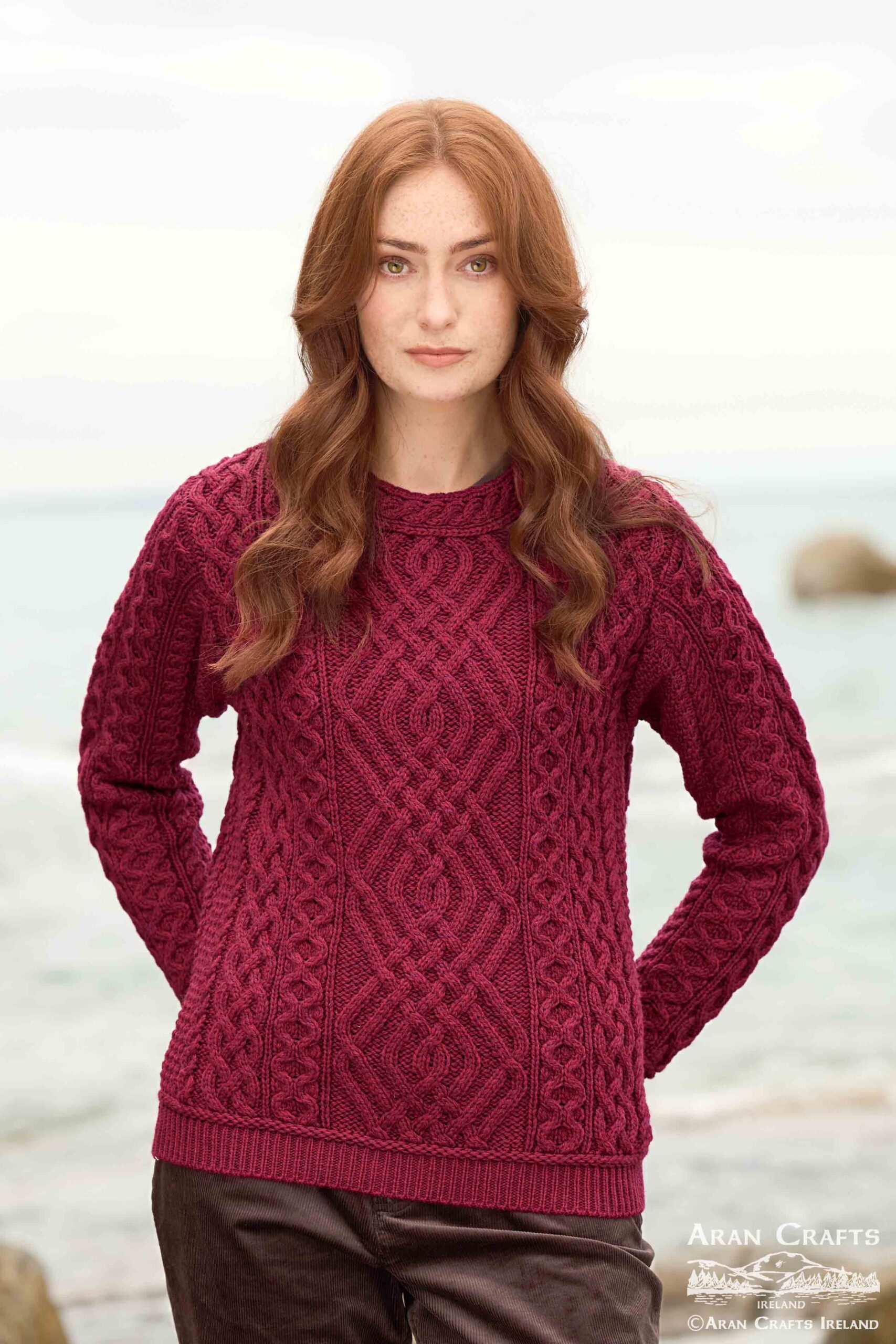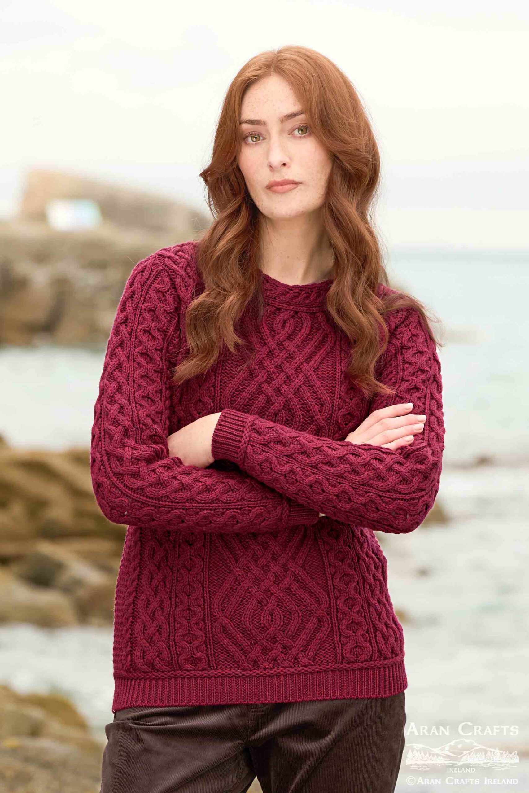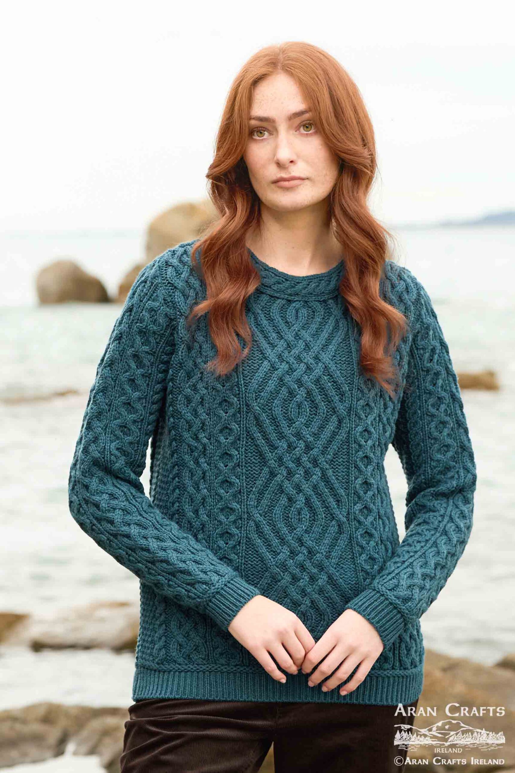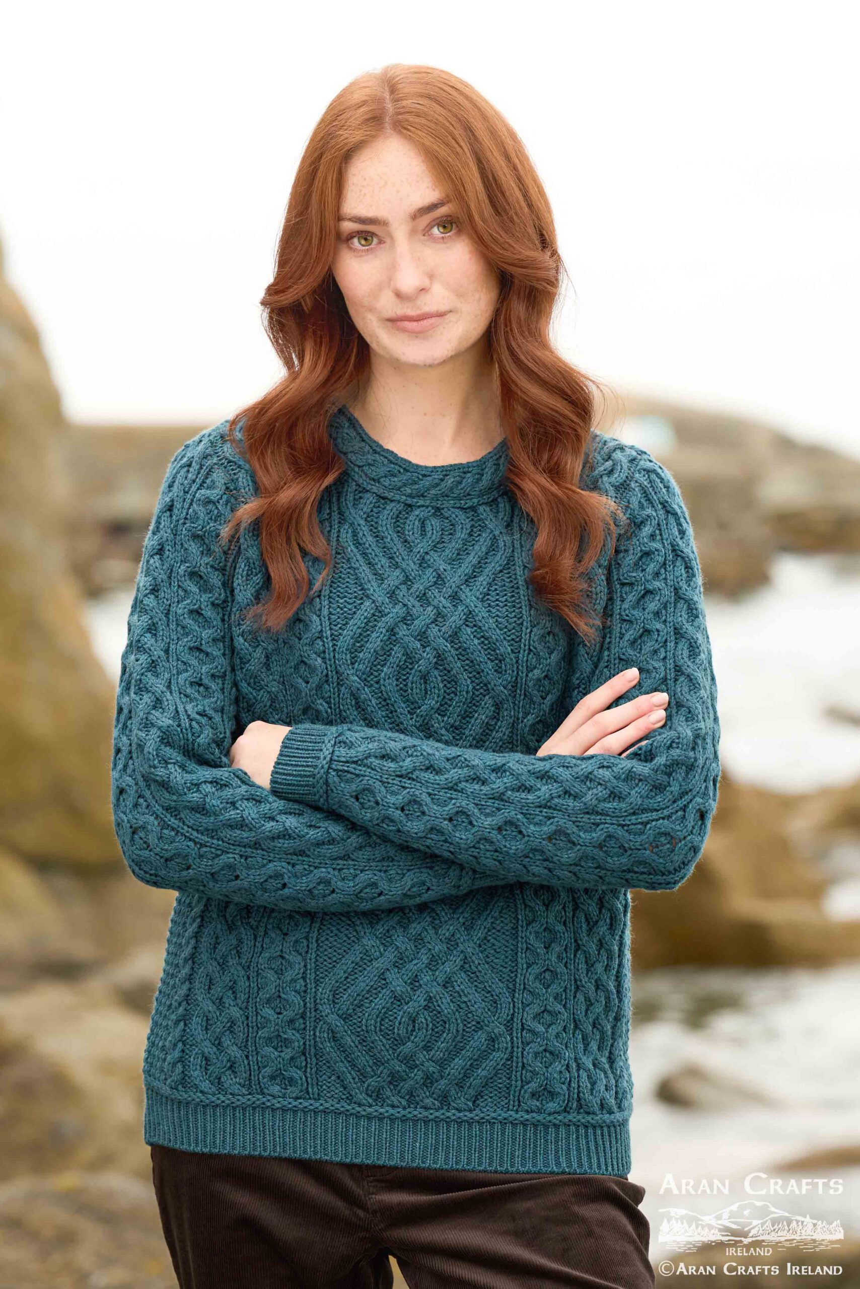 This beautiful cable knit crew neck sweater showcases a variety of traditional Aran stitches, including the trellis, honeycomb, moss, and cable patterns. The intricate design extends through the entire sweater, with a standout feature of the cable knit neck and a cohesive cable stitch pattern across the body. This timeless piece combines heritage craftsmanship with a modern fit, making it a versatile addition to any wardrobe.