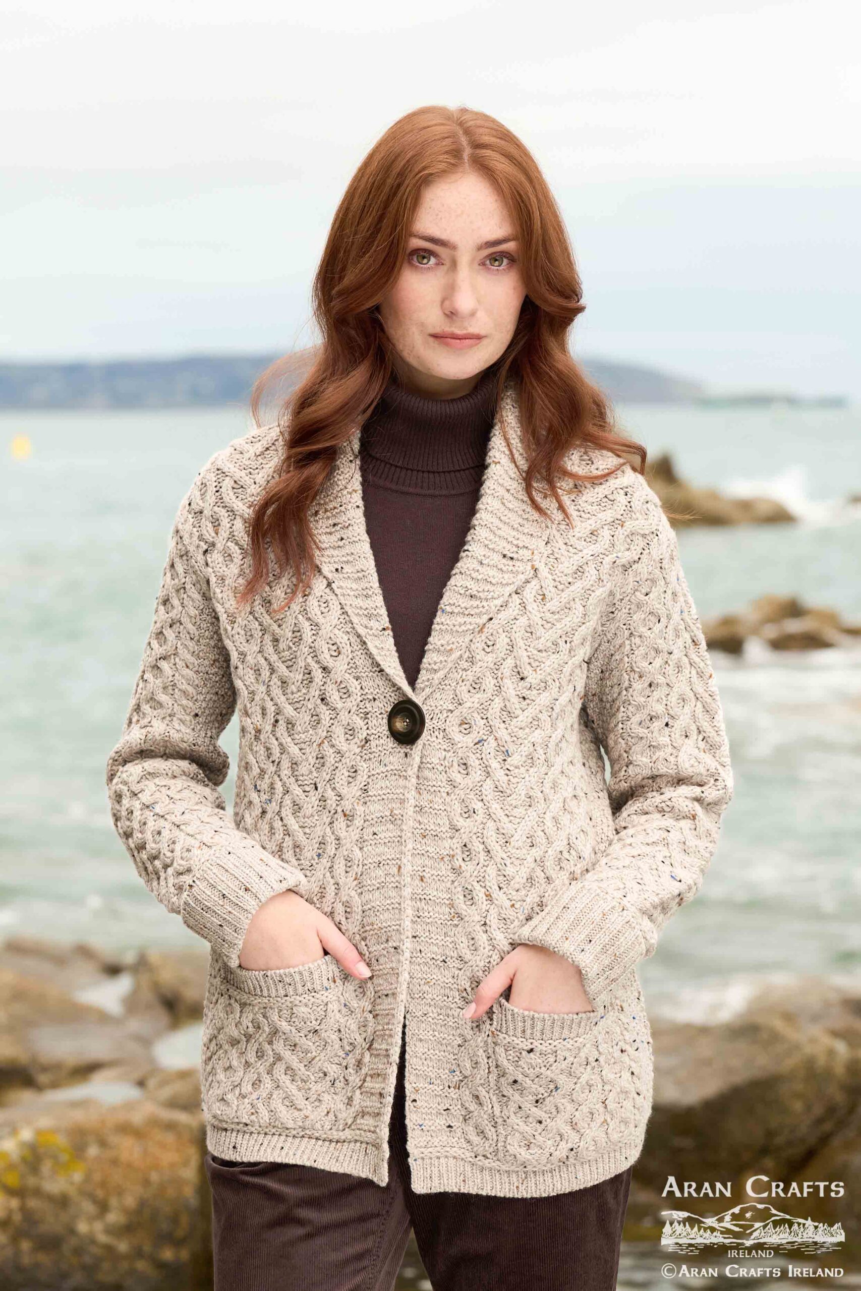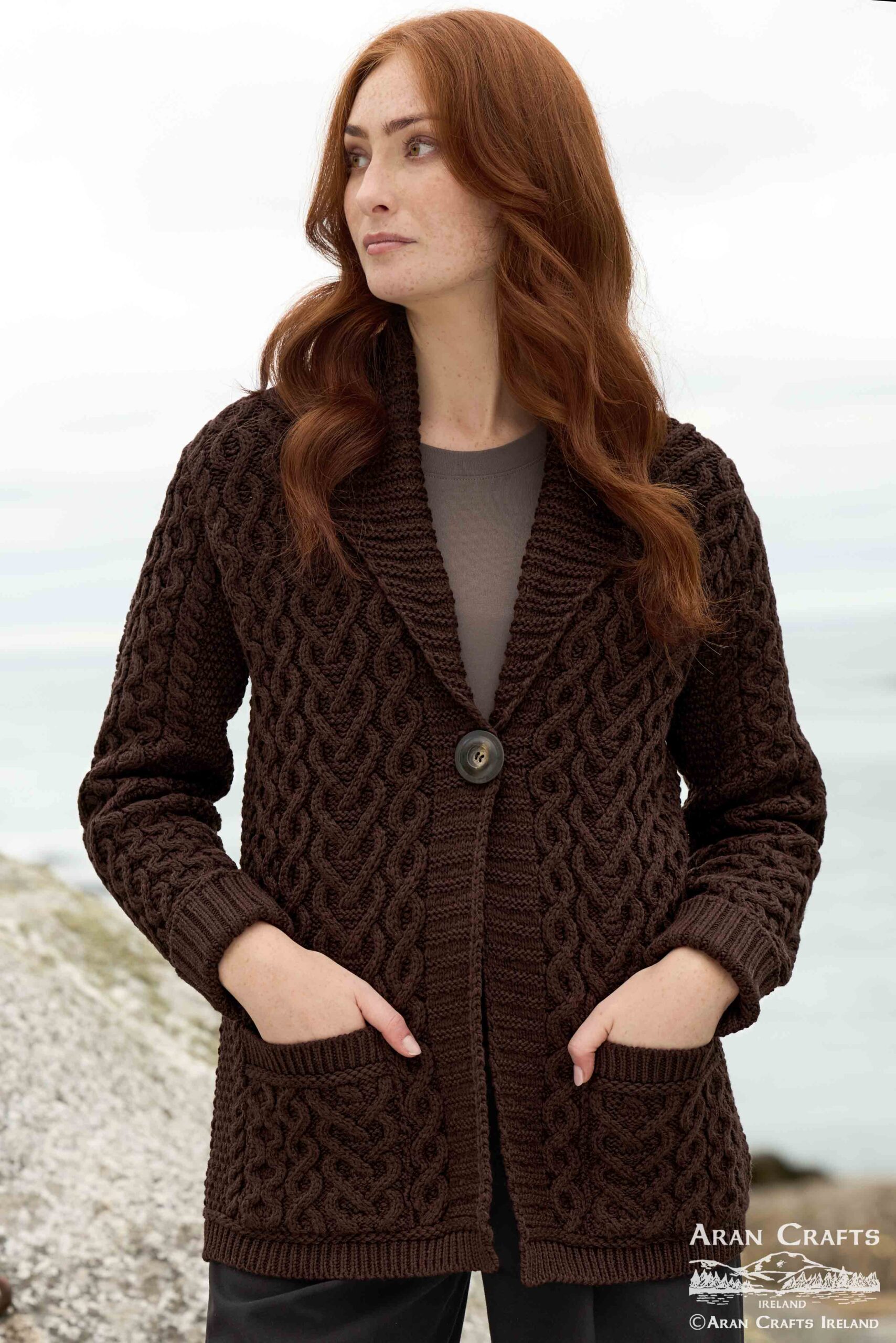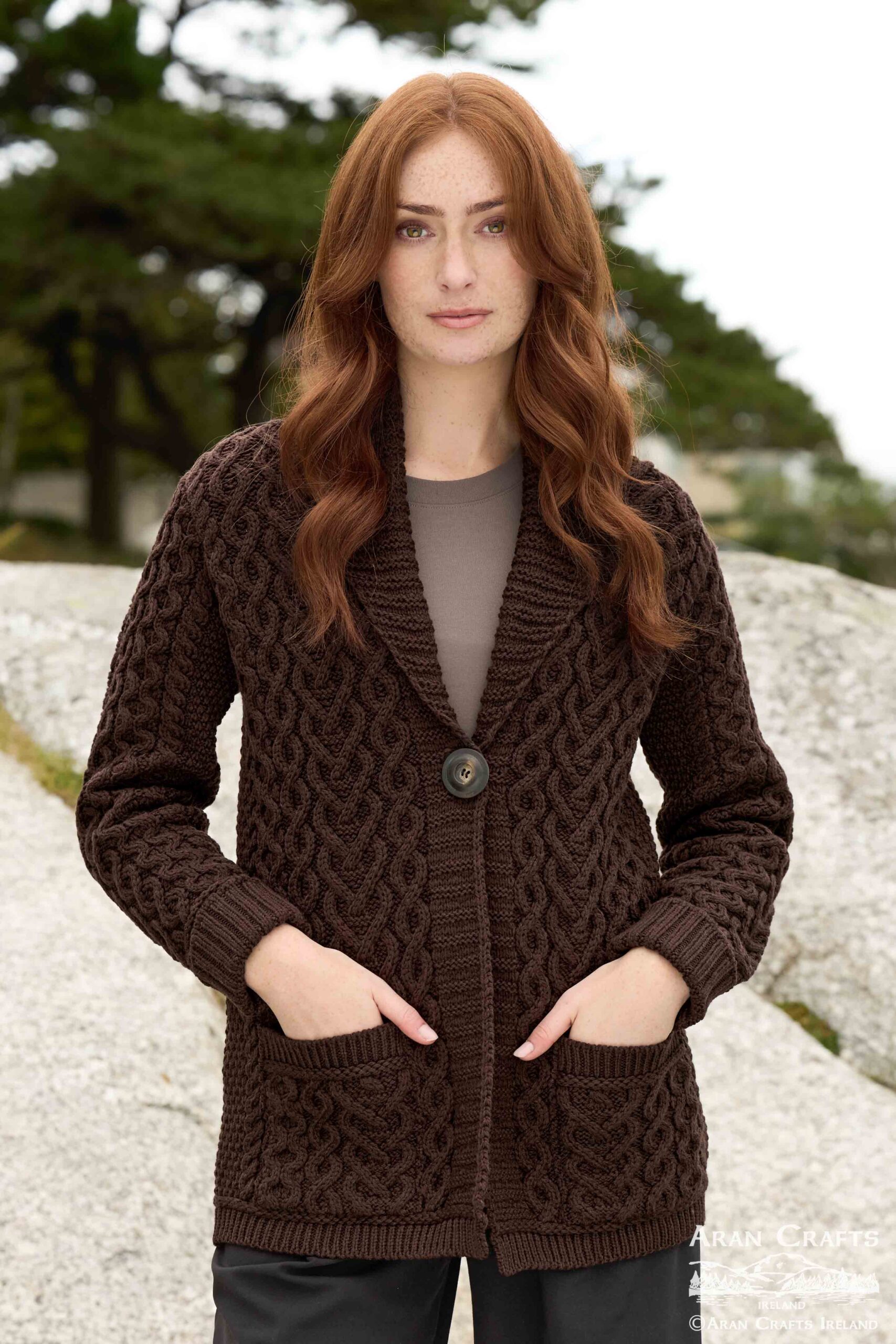 Charming heart-design cardigan with a one-button closure, knitted using a mix of traditional Aran cable stitches and a heart design pattern. This Irish cardigan also features patch pockets for added comfort.