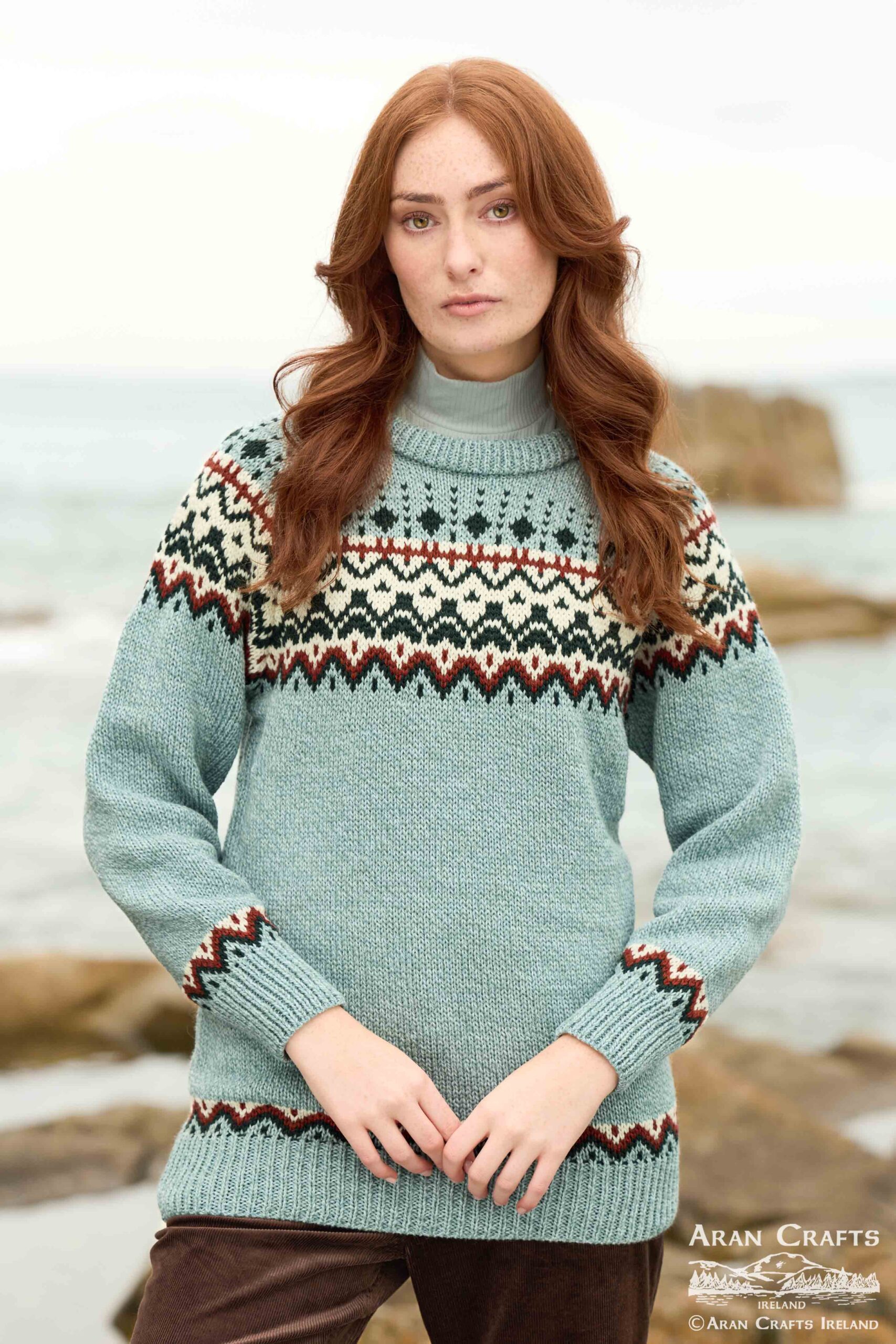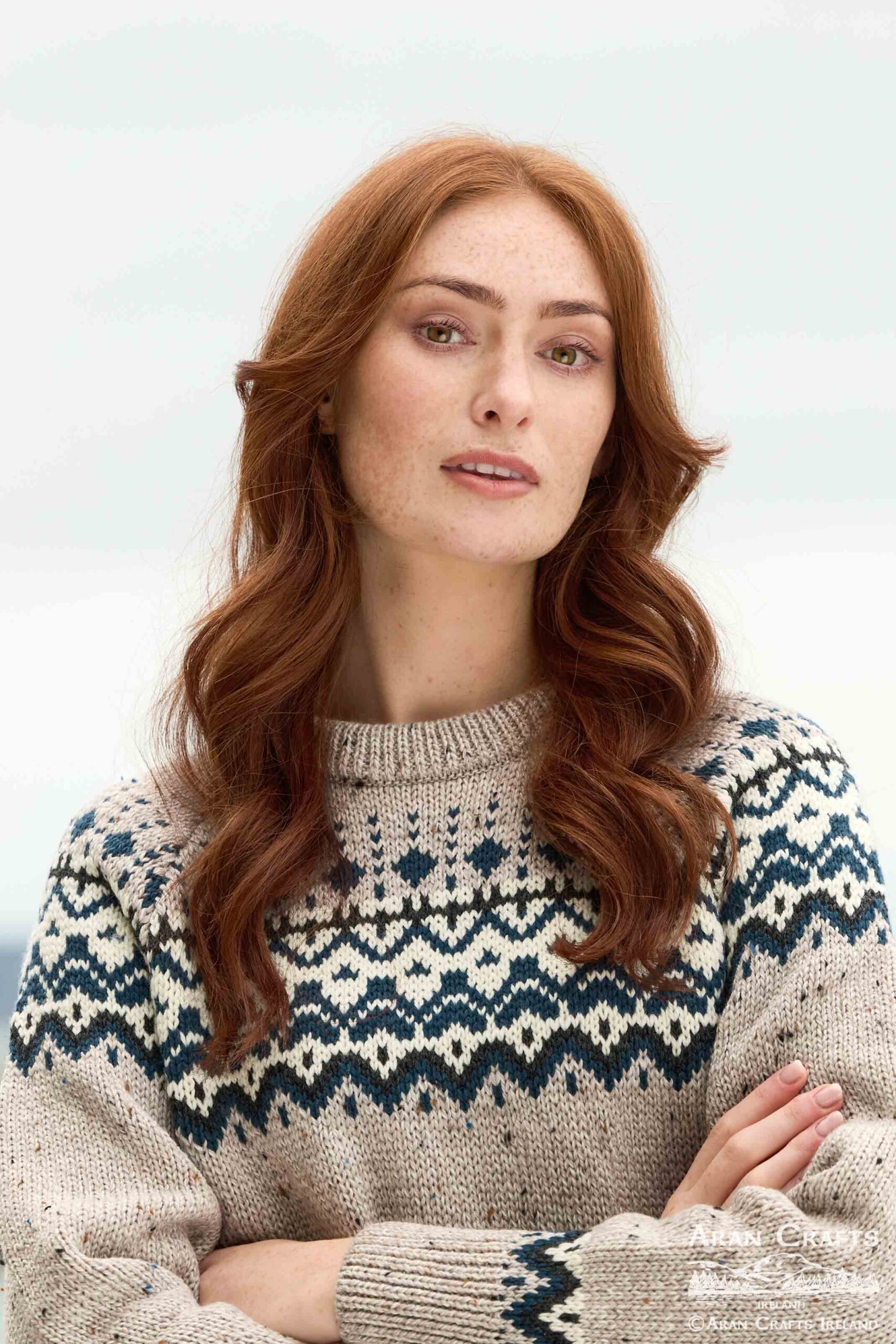 This Ladies Icelandic crew-neck sweater features traditional Aran stitches paired with a striking Icelandic design. The bold contrasting detailing adds visual interest, making it a standout piece, available in Mermaid and Oatmeal Nep.