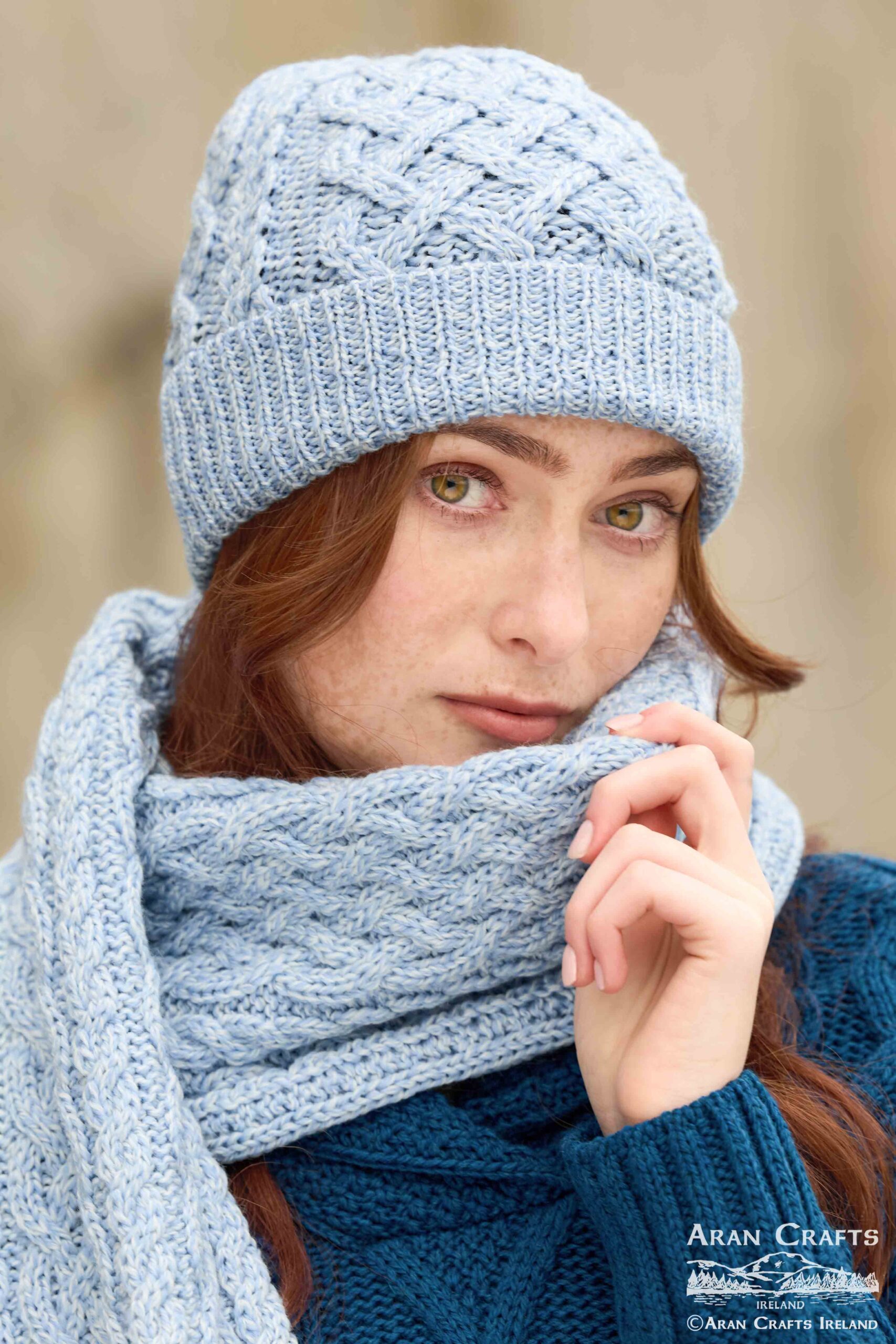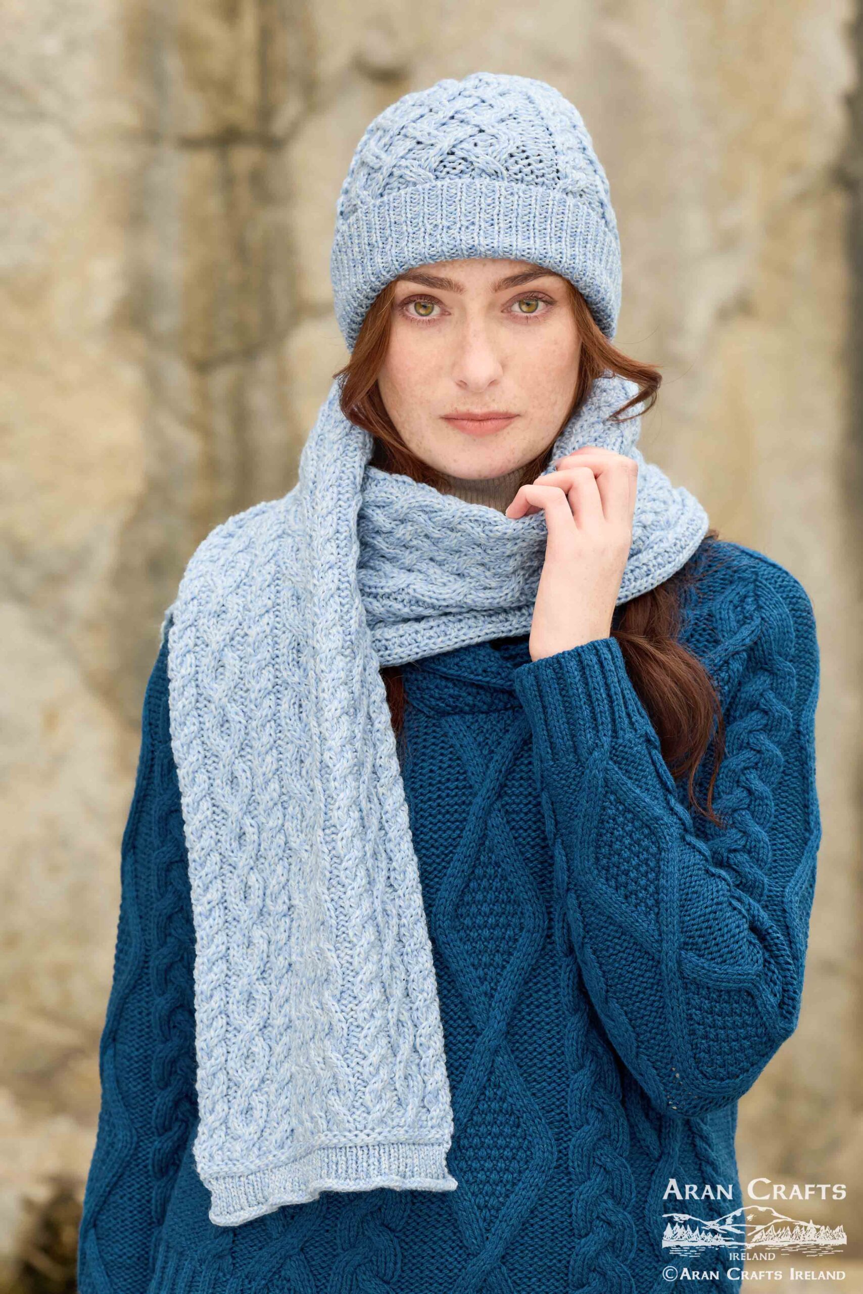 Beautiful Aran unisex scarf made from merino wool is sure to keep you warm and cozy. The scarf is knit using the traditional Trellis stitch. Also Matching Hat available. Scarf size: 9.5″ X 60″ inches.