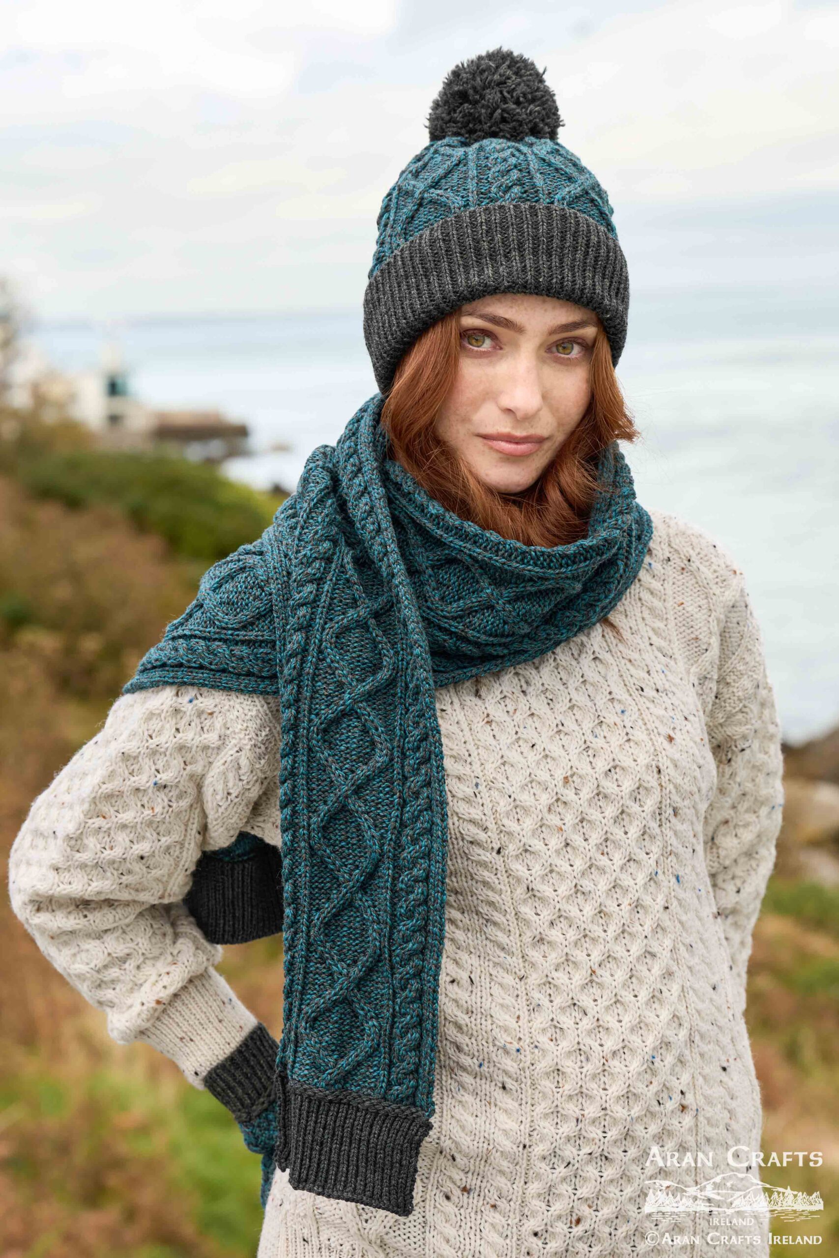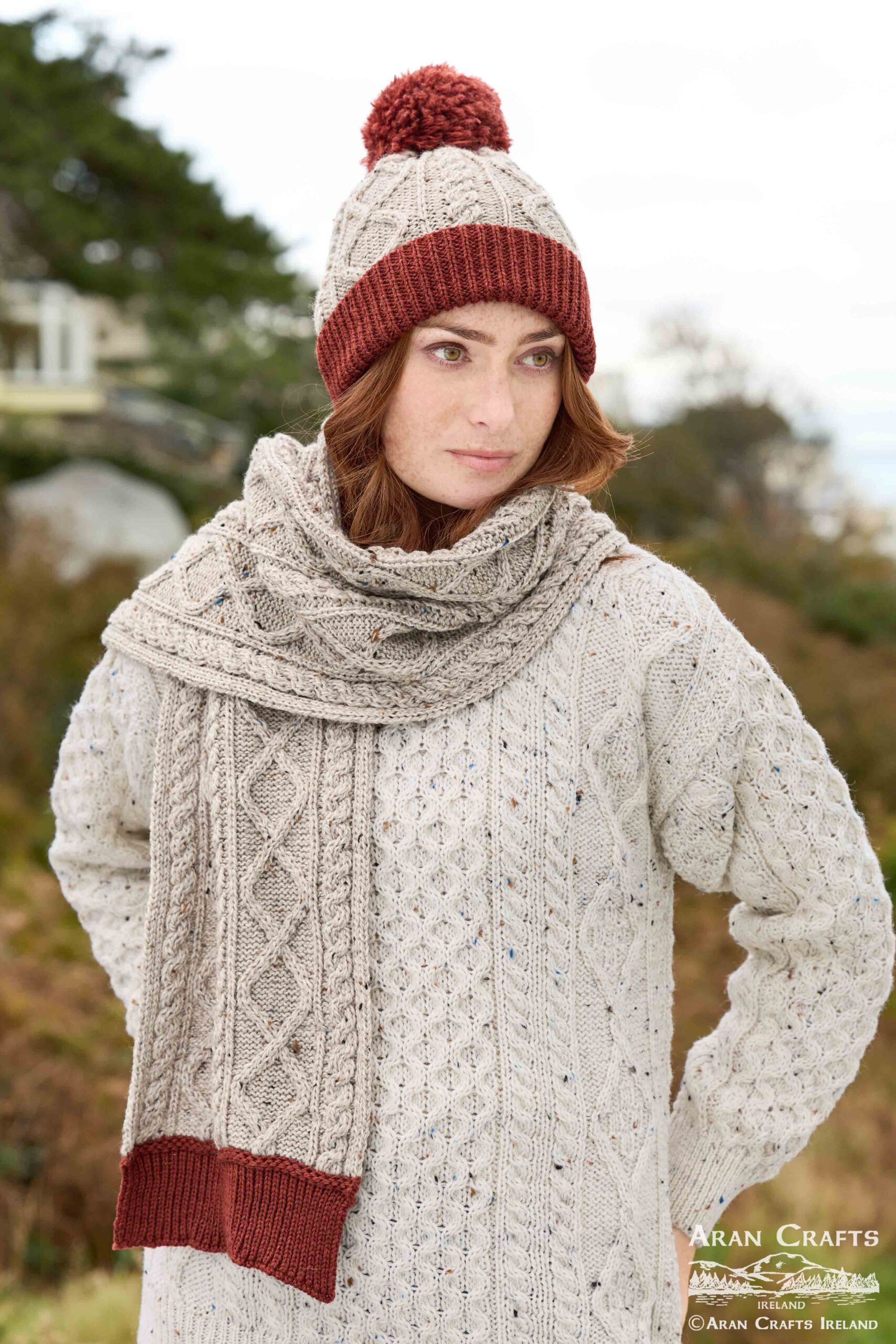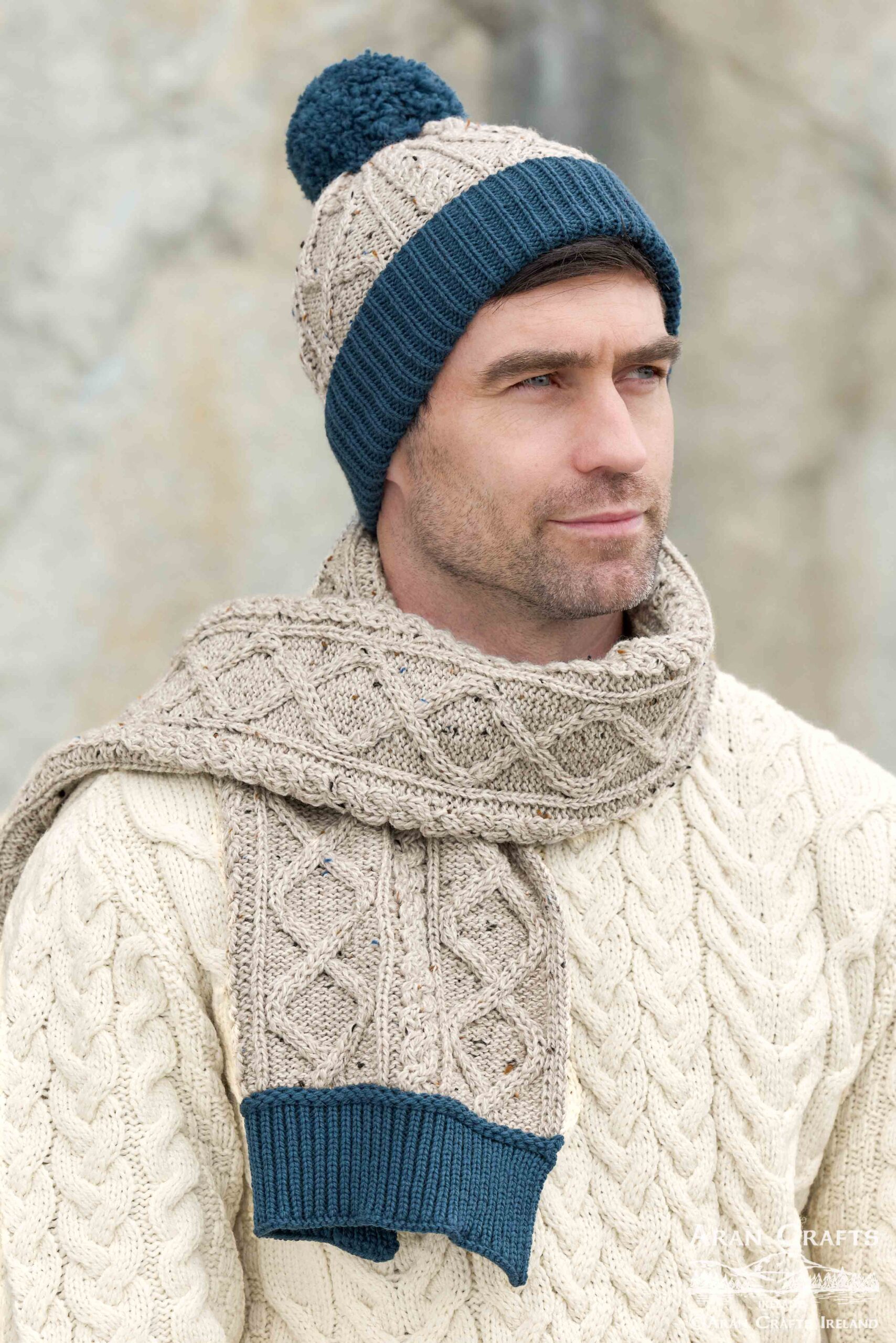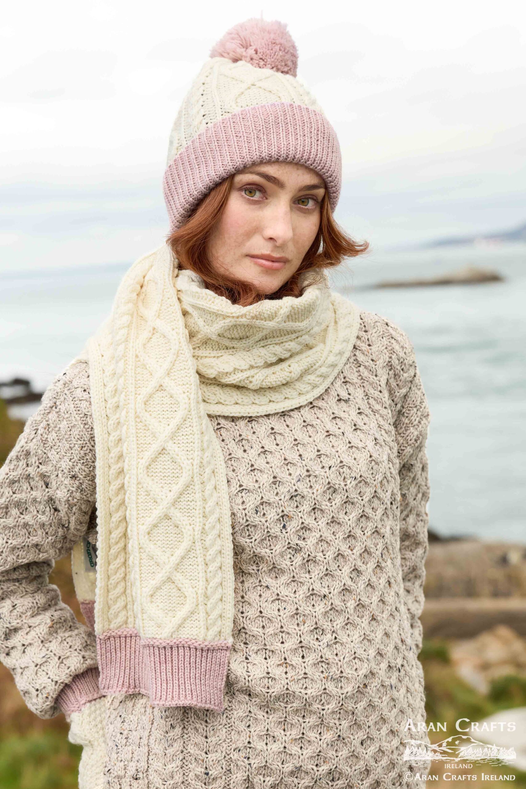 Two-Tone Pom Pom Hat featuring the traditional diamond-knit Aran pattern. Crafted with two complementary colours, this unisex hat is both stylish and warm, making it a perfect accessory for colder days.