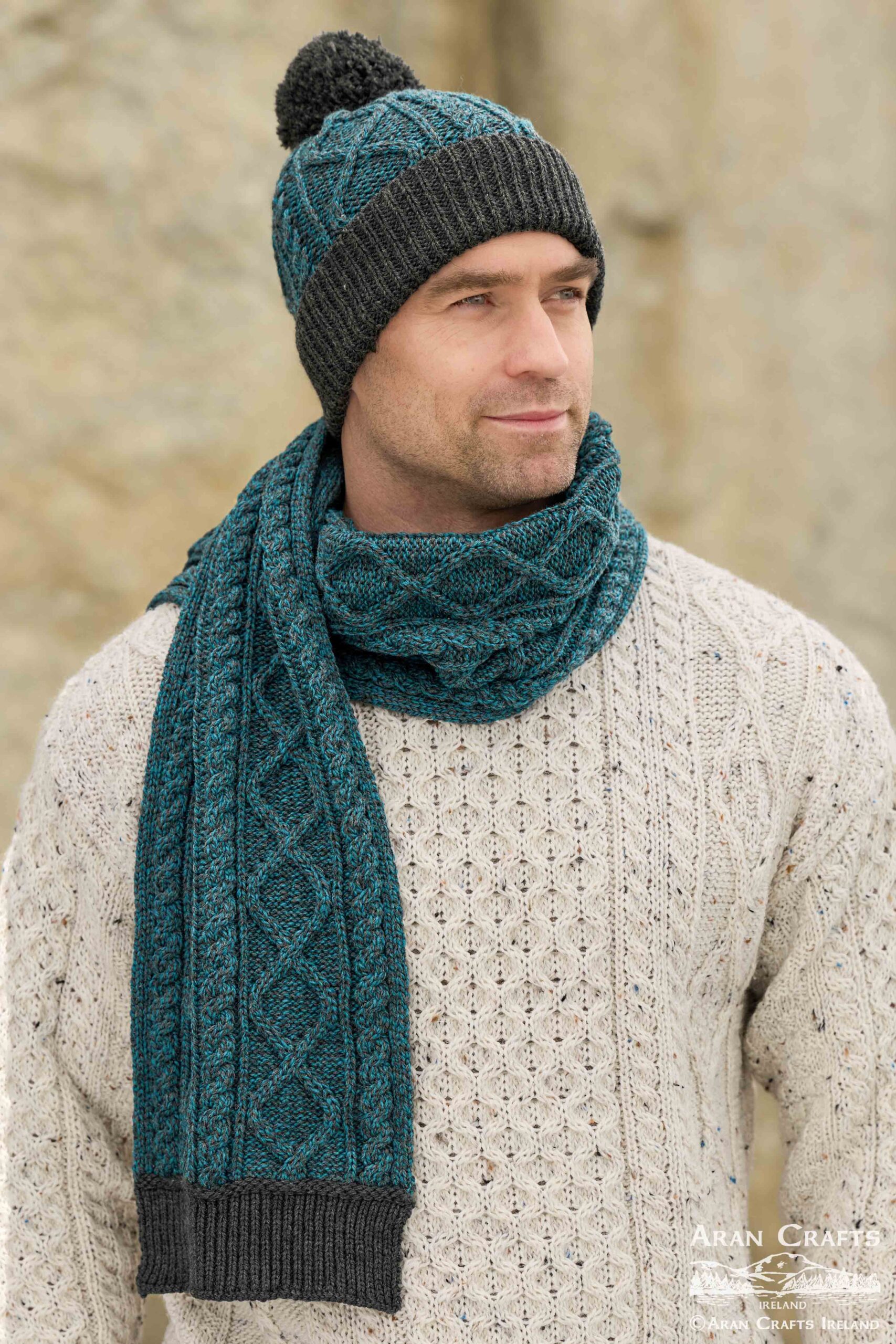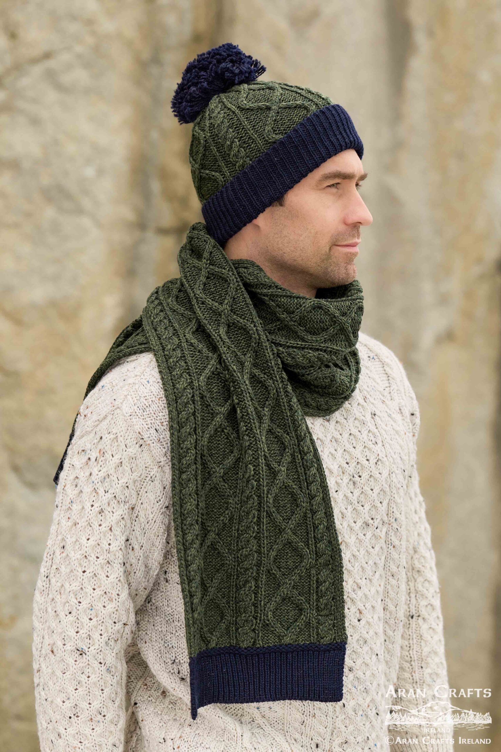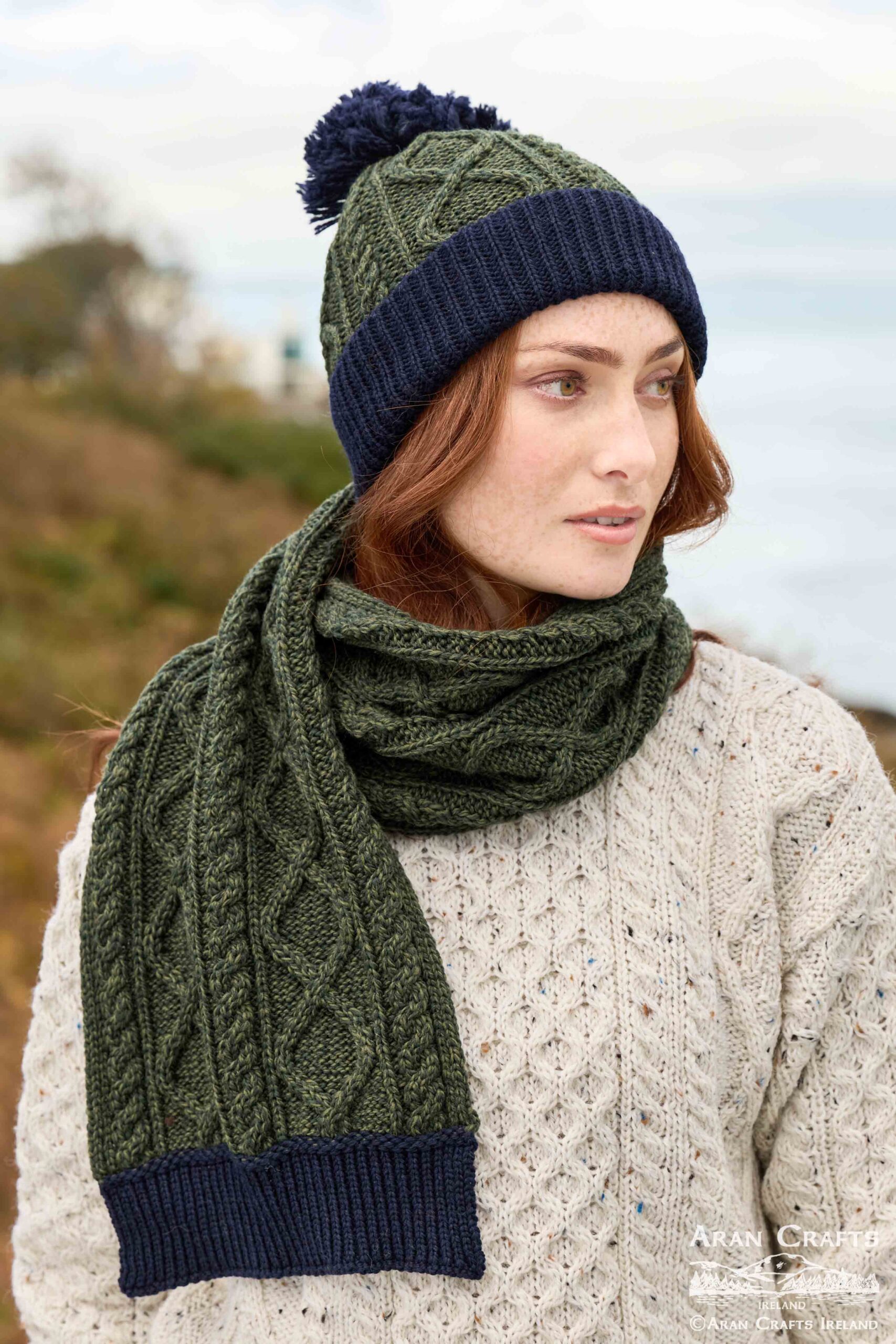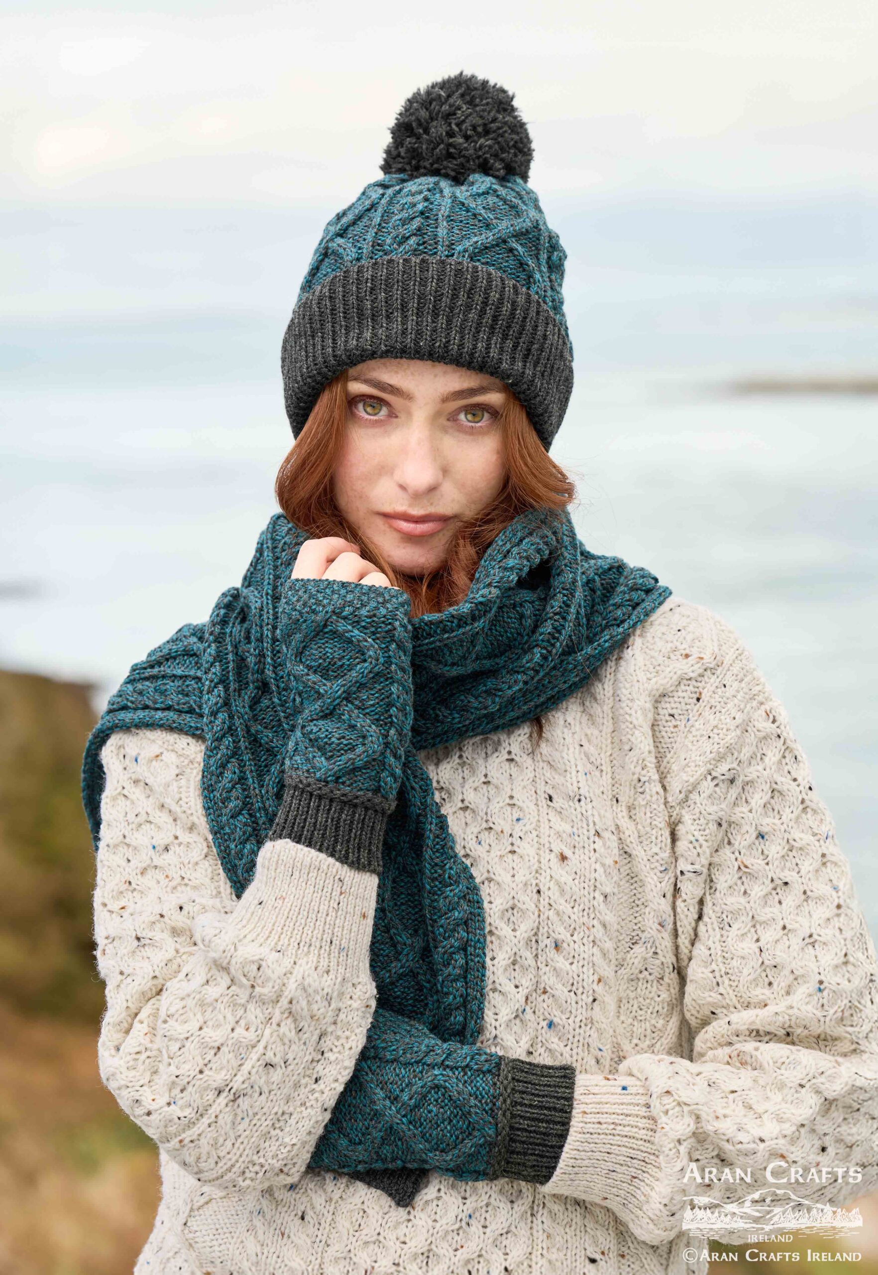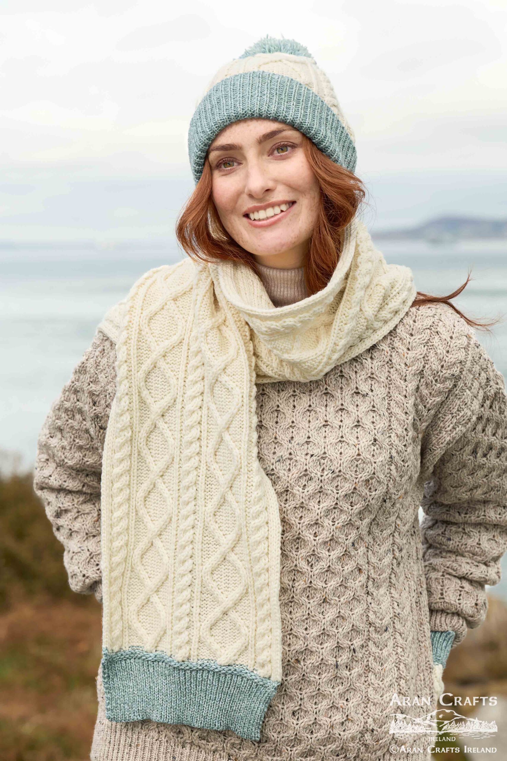 Two-Tone Pom Pom Hat featuring the traditional diamond-knit Aran pattern. Crafted with two complementary colours, this unisex hat is both stylish and warm, making it a perfect accessory for colder days.
